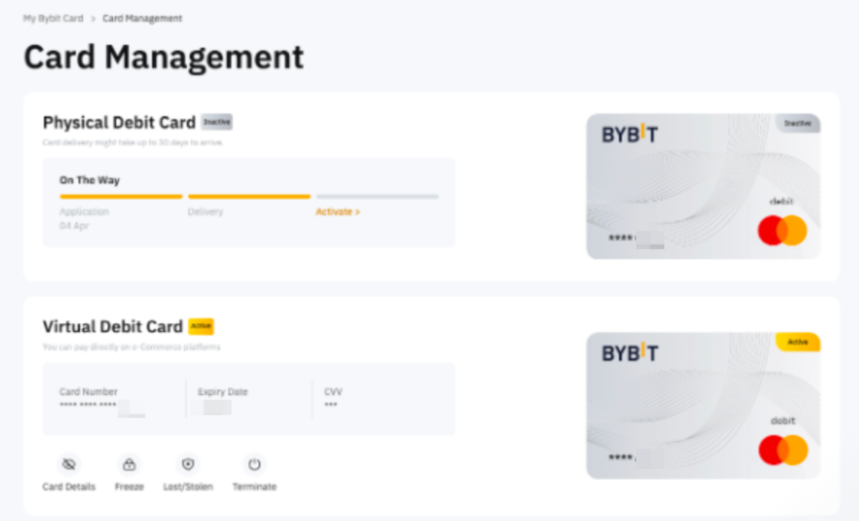 After you have verified with your CVV, you can now use your physical Bybit Card! You can manage both your virtual and physical Bybit Card on the Card Management page.