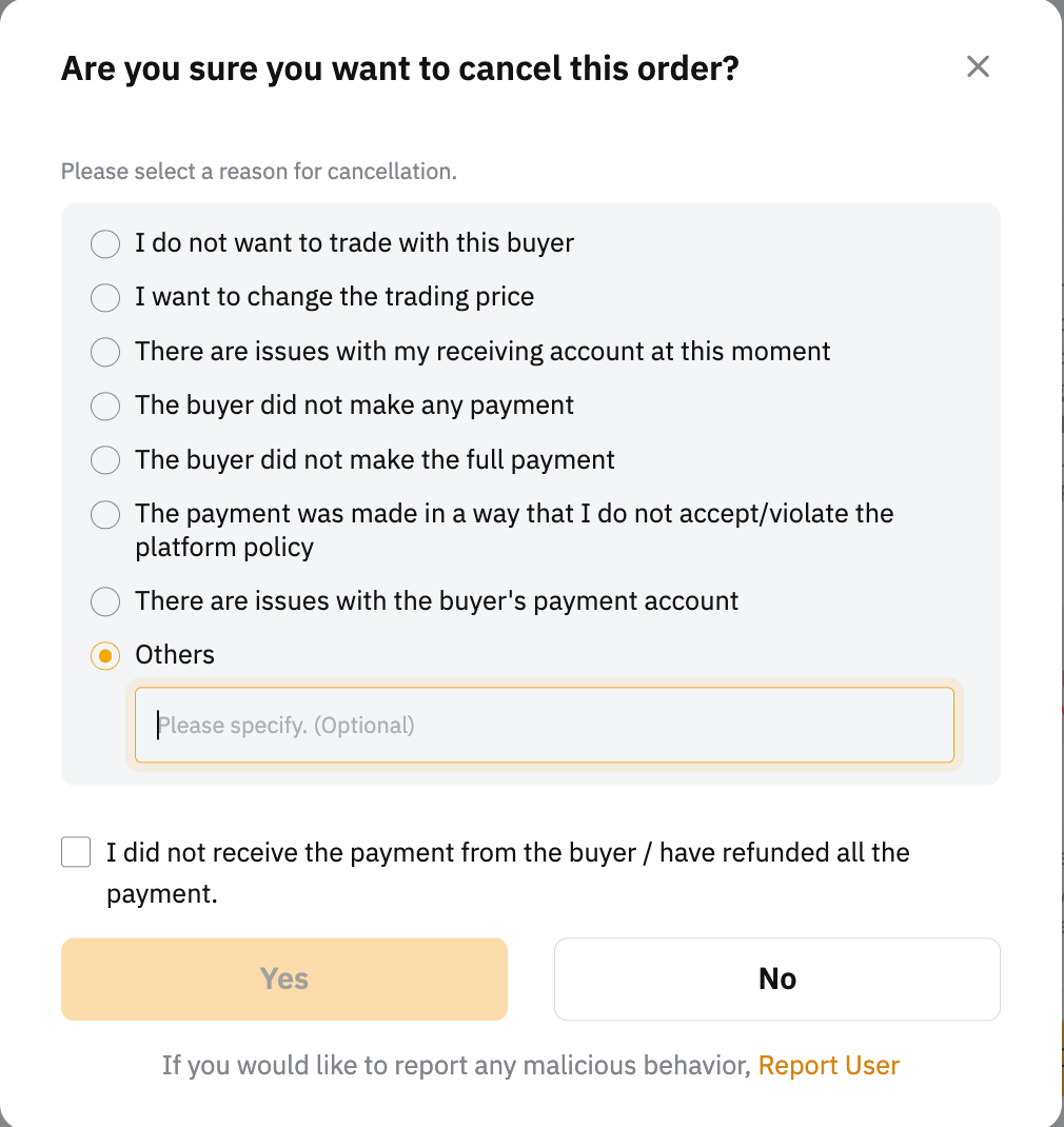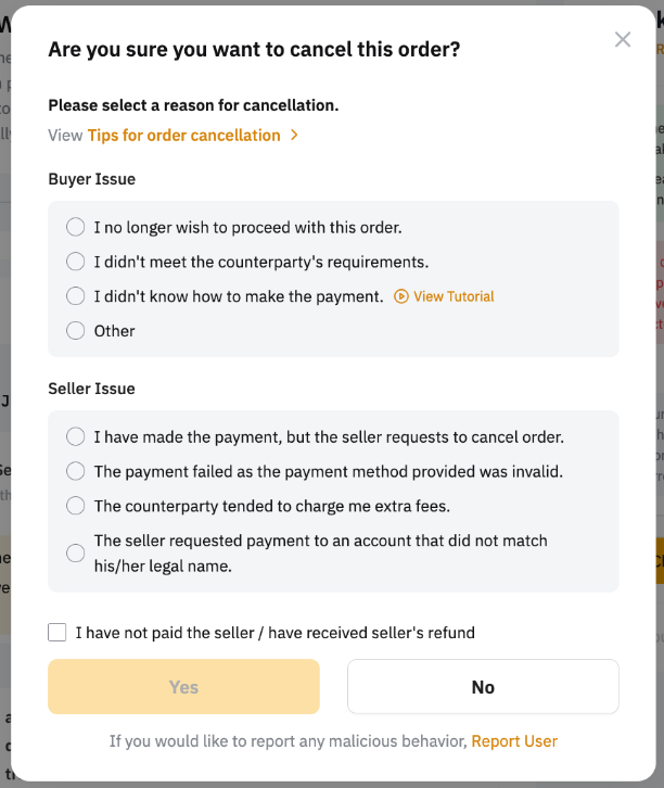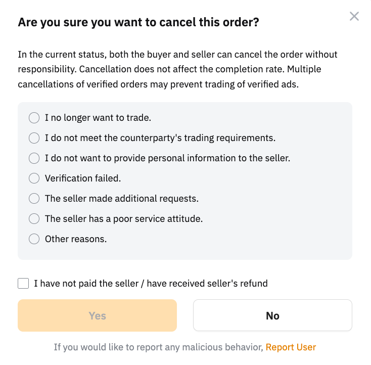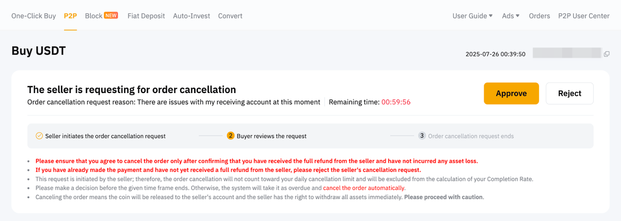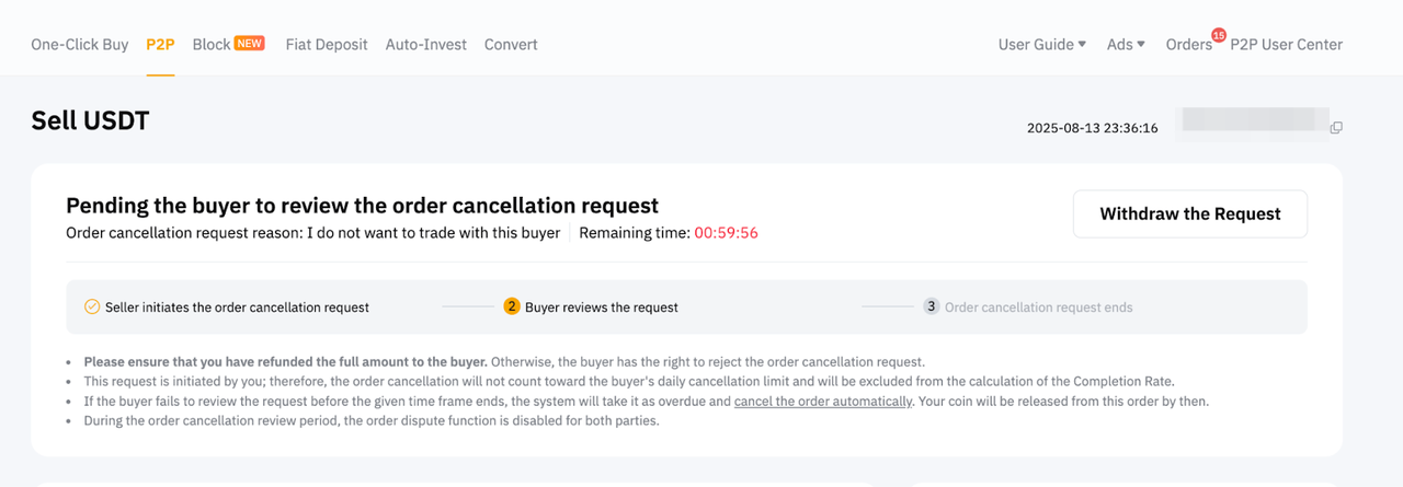BUYERS may cancel P2P orders up to 3 times within 24 hours. If the cancellation reason is due to the Buyer Issue, and once the cancellation limit is reached, the P2P trading function will be restricted for 24 hours.