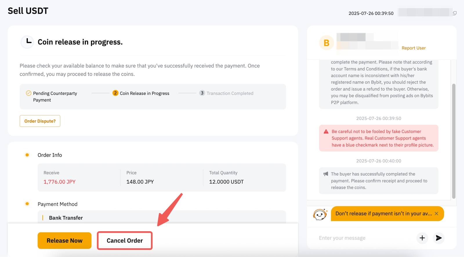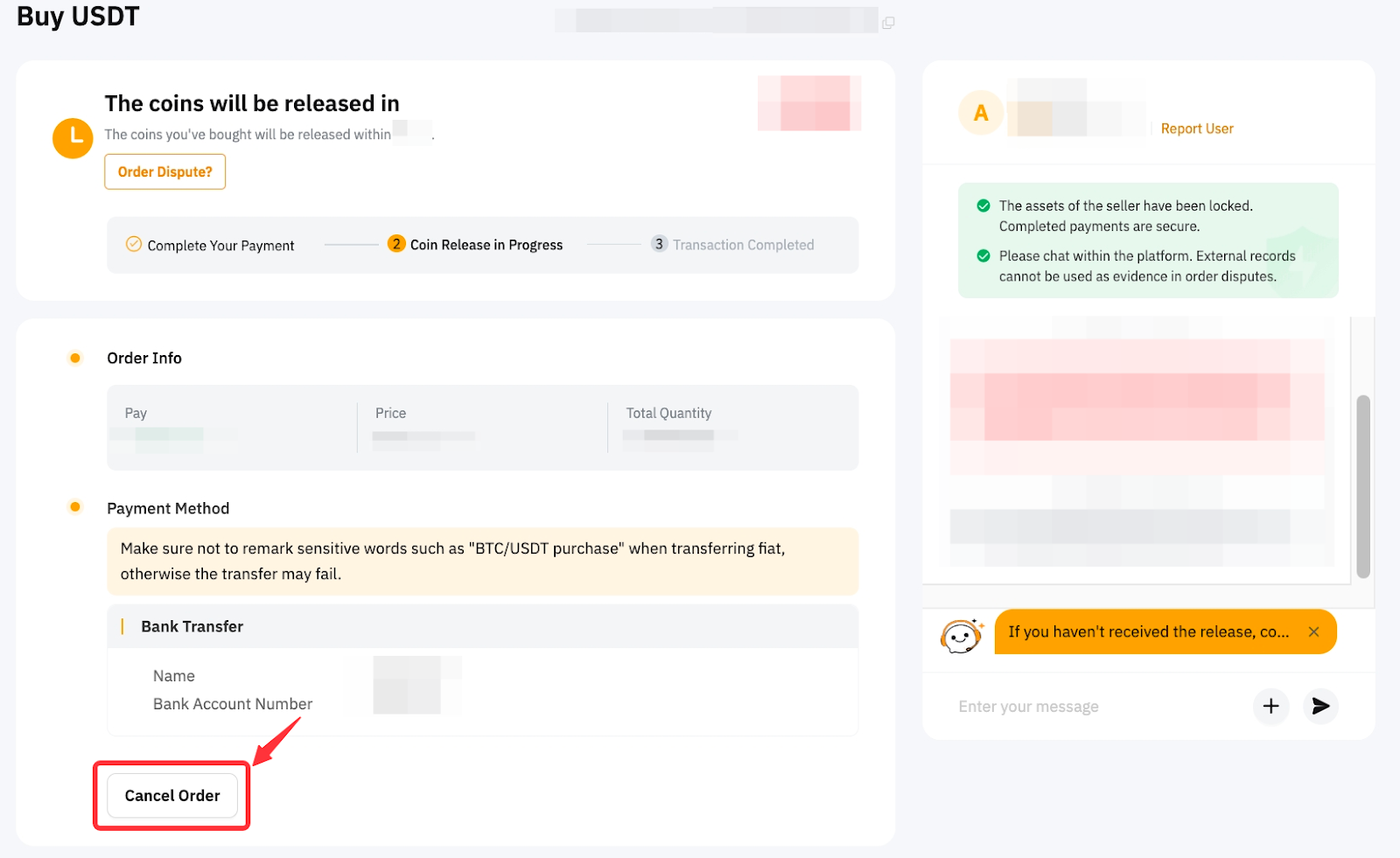 Step 1: Click on Cancel Order at the bottom of your P2P Order Page.