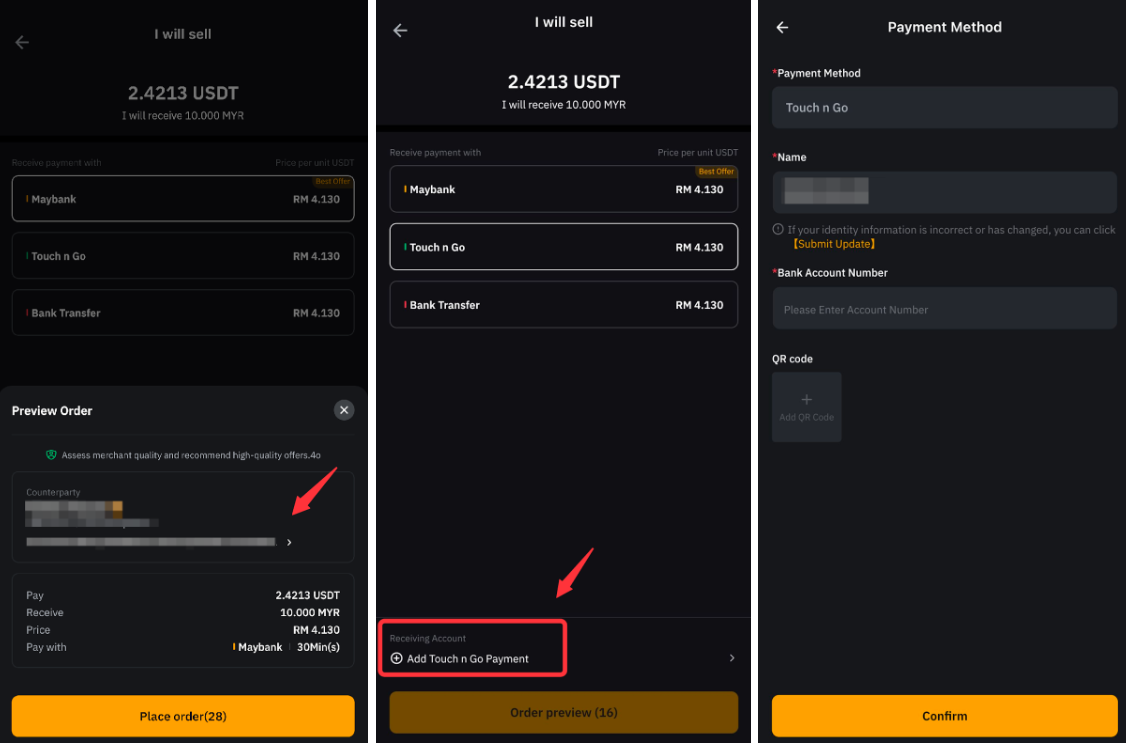 The payment method listed by the advertiser will be shown. If you have not added the matched payment method, please add it by clicking the Add Payment Method button and filling in your payment receiving account.